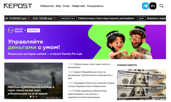 Бегущая строка – это удобный визуальный агрегатор последних новостей из всех разделов нашего сайта. Она добавляет динамики, кликабельна и позволяет, не покидая открытую страницу, быстро просматривать заголовки и переходить к материалам других категорий. Это традиционный инструмент журналистики, широко используемый порталами и таблоидами, и мы рады, что он теперь доступен нашим читателям, – сказал Фарход Ташпулатов, главный редактор Repost.uz