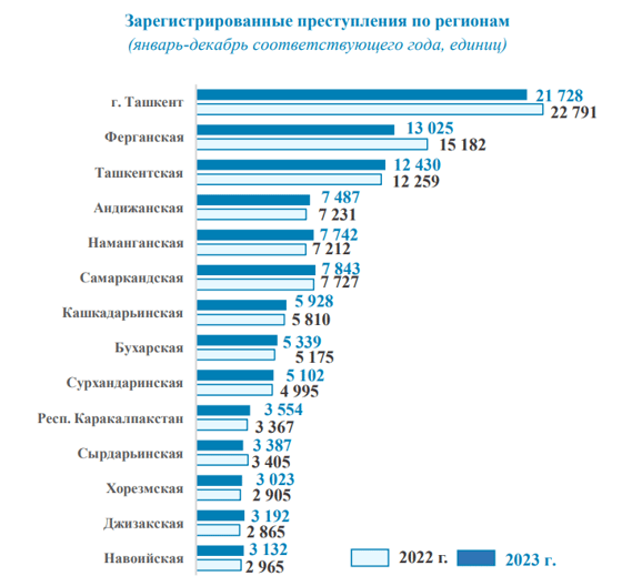 В прошлом году наибольшее число преступлений зафиксировали в Ташкенте (21 728), Ферганской (13 025), Ташкентской (12 430) и Андижанской (7 487) областях. Наименьшее — в Джизакской (3 192), Сырдарьинской (3 387) и Хорезмской (3 023) областях.