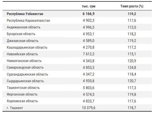 На втором месте располагается Навоийская область — 7,6 млн сумов (+15,1%), на третьем — Ташкентская область с 5,8 млн сумов (+17,3%).