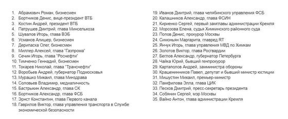 В санкционном списке фигурируют, в частности, бизнесмены Алишер Усманов, Роман Абрамович и Олег Дерипаска, председатель «Роснефти» Игорь Сечин, глава «Газпрома» Алексей Миллер, гендиректор «Первого канала» Константин Эрнст, главный редактор RT Маргарита Симоньян, председатель Следственного комитета Александр Бастрыкин, директор ФСБ Александр Бортников, директор Росгвардии Виктор Золотов.