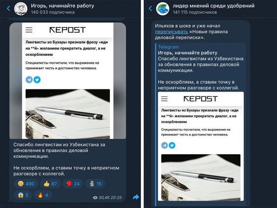 В свою очередь, Telegram-канал «Игорь, начинайте работу» (более 140 тысяч подписчиков) поблагодарил лингвистов из Узбекистана за обновление правил деловой коммуникации. Похожий пост появился и в канале «Лидер мнений среди удобрений» (141 тысяча подписчиков).