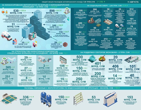 Стоит отметить, что Антикризисный фонд был создан по указу президента в конце марта и его бюджет составлял 10 трлн сумов. Это означает, что уже израсходовано 80 процентов средств фонда.