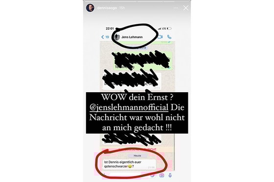 Йенс Леманн послал сообщение экс-защитнику национальной команды, «Гамбурга» и «Шальке» Деннису Аого, в котором выделил расовую принадлежность и прикрепил смеющийся смайлик.