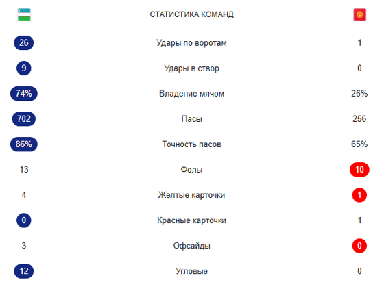 Сборная Узбекистана по футболу одолела Кыргызстан со счетом 1:0 в рамках очередного тура третьего раунда квалификации на чемпионат мира 2026 года.