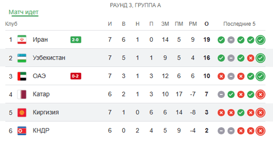 Узбекистан с 16 очками располагается на втором месте группы А.