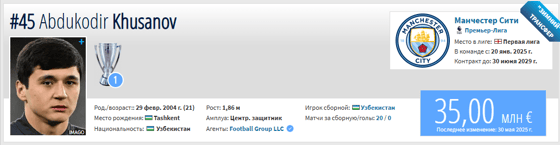 Рыночная стоимость узбекского защитника «Ман Сити» осталась без изменений. Футболист по-прежнему оценивается в €35 млн.