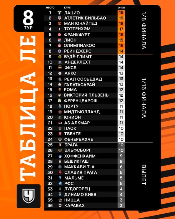 По итогам восьмого тура общего этапа Лиги Европы сезона 2024/2025 определились все участники плей-офф.