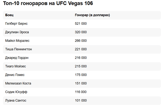 Ниже представлен топ-10 гонораров на UFC Fight Night в Лас-Вегасе: