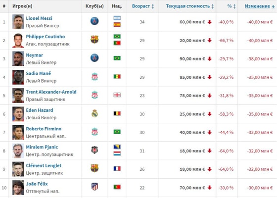 В начале года Месси стоил €100 млн. В августе, когда он уходил из «Барселоны» в «ПСЖ», — уже €80 млн. А под новый год цена на аргентинского нападающего упала еще на €20 млн.