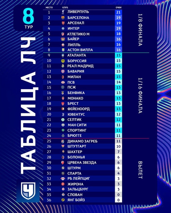 В ночь на четверг состоялись матчи заключительного тура общего этапа Лиги чемпионов сезона 2024/2025, по итогам которого были распределены прямые путевки в 1/8 финала турнира.
