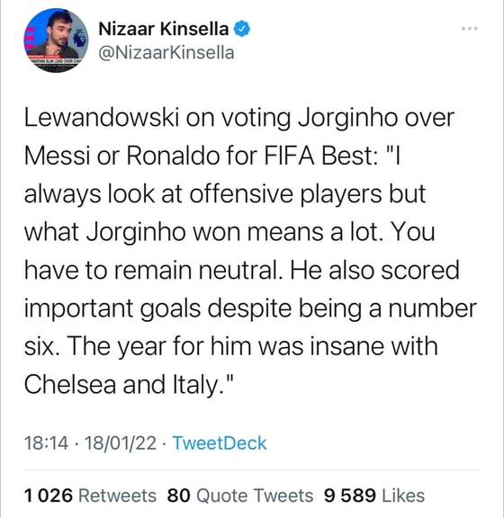 Нападающий «Баварии» Роберт Левандовски рассказал, почему он отдал свой голос Жоржиньо в голосовании за лучшего игрока мира по версии FIFA.