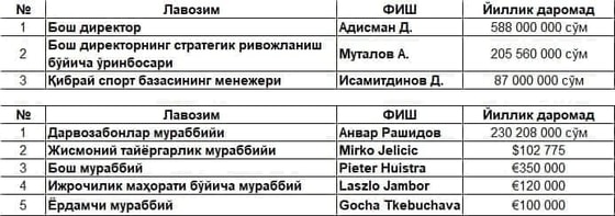 Таким образом, можно увидеть, что главный тренер футбольного клуба Петер Хёйстра зарабатывает 350 тысяч евро в год, а его помощник Гоча Ткебучава — 100 тысяч евро. Зарплата генерального директора клуба Д. Адисмана составляет 588 миллионов сумов в год.