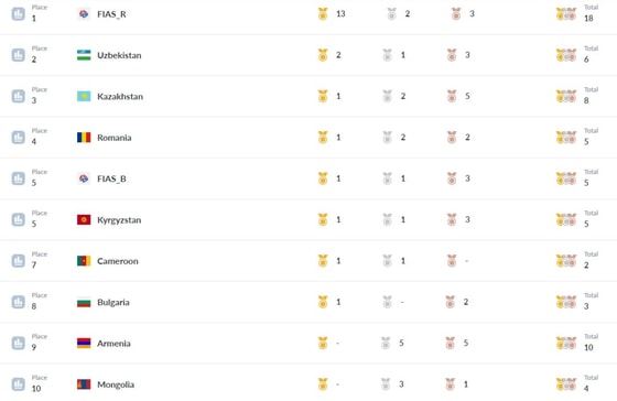 Россия расположилась на первом месте (13 золотых, две серебряные и три бронзовые награды), а Казахстан на третьем (одна золотая, две серебряные и пять бронзовых медалей).