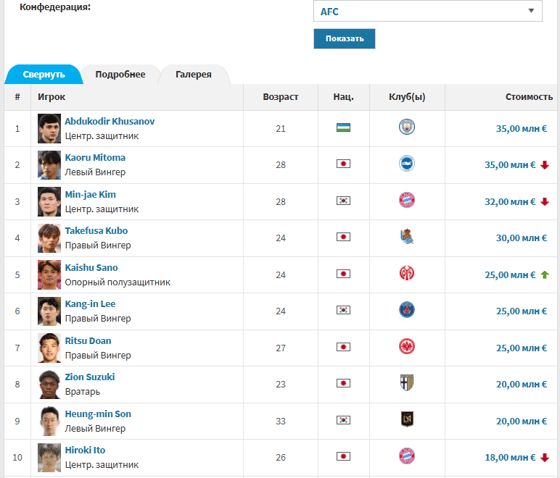 После октябрьского обновления 21-летний игрок занял лидирующую позицию, его стоимость составляет €35 млн. Вместе с ним список возглавляет японский полузащитник «Брайтона» Каору Митома, который также оценивается в €35 млн. Тройку лидеров замыкает южнокорейский защитник «Баварии» Ким Мин Чжэ — €32 млн.