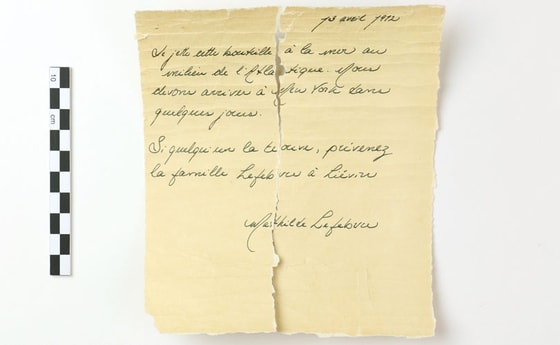 В бутылке оказалось письмо, которое датируется 13 апреля 1912 года. Оно написано от лица девочки Матильды Лефевр. По данным специалистов, девочка с таким именем действительно была пассажиркой третьего класса затонувшего судна. Ученые также связались с ныне живущими родственниками Матильды.