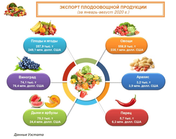 Основные рынки экспорта плодоовощной продукции приходятся на Казахстан, Российскую Федерацию, Кыргызстан и Афганистан.