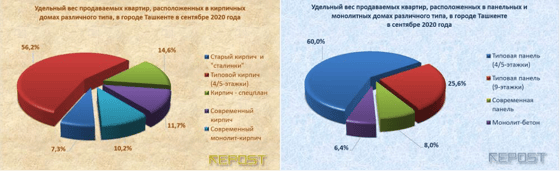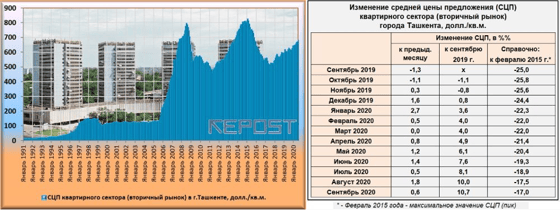 Цена предложения в национальной валюте за сентябрь 2020 года повысилась на 1,1% - до 7 048,6 тысячи сумов/кв.м. Уровень СЦП квартир в сентябре текущего года превысил показатель сентября 2019 года (год к году - г/г) на 10,7% в долларовом выражении и на 21,1% - в сумовом. Значительный рост показателей, выраженных в национальной валюте, объясняется резкой девальвацией сума, которую провёл Центральный банк Узбекистана. 14-16 апреля 2020 года наблюдалось ослабление национальной валюты на 530,9 сума или на 5,5%. Необходимо учитывать и перманентное ослабление национальной валюты.