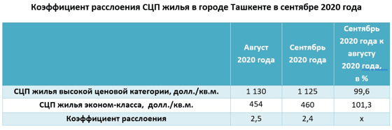 Коэффициент расслоения (отношение СЦП жилья высокой ценовой категории и жилья эконом-класса) в сентябре 2020 года составил 2,4 (в предыдущем месяце этот показатель составлял 2,5).