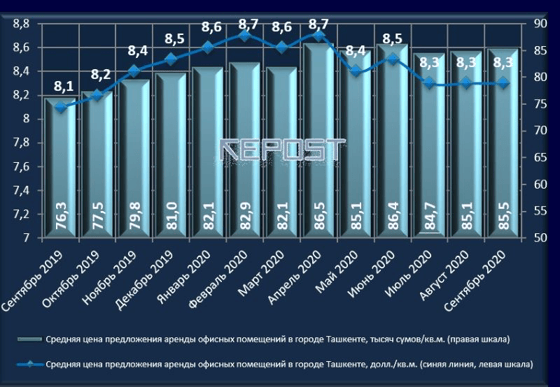 - Средняя стоимость аренды офисов в сентябре 2020 года в столице осталась на уровне июля-августа текущего года – 8,3 доллара/кв.м. В сумовом выражении размер аренды за сентябрь 2020 года увеличился на 0,6% и составил 85,5 тысячи сумов/кв.м.