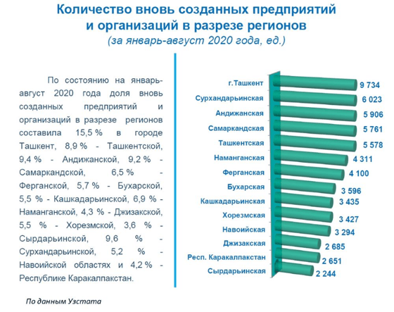 Наблюдается активность по организации новых предприятий и организаций в Ташкенте. Если по состоянию на 1 августа 2020 года количество вновь созданных предприятий и организаций в столице достигло 8 603 единицы (прирост по сравнению с предыдущим месяцем составил 19,4%), то на 1 сентября этот показатель возрос до 9 734 единицы (ежемесячный прирост – 13,1%).