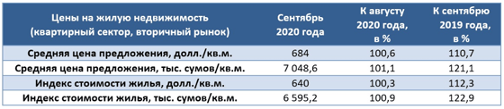 В сентябре 2020 года средняя цена предложения (СЦП) жилой недвижимости (квартирный сектор, вторичный рынок) города Ташкента составила 684 доллара/кв.м. Это на 0,6% выше уровня аналогичного показателя предыдущего месяца.
