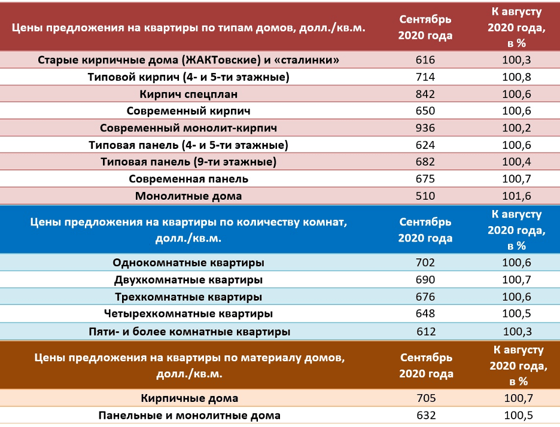 С июля 2019 года наблюдалась стабилизация цен в этом секторе жилья: цены предложения в старых кирпичных домах в этом месяце достигли «дна» и начали расти. В сентябре 2020 года цены на квартиры, расположенные в старых кирпичных домах, повысились на 0,3% до 616 долларов/кв.м. В 4-х и 5-ти этажных кирпичных домах типовой планировки СЦП увеличилась за сентябрь 2020 года на 0,8% (714 долларов/кв.м.) В 4-х и 5-ти этажных панельных домах типовой планировки СЦП увеличилась за сентябрь 2020 года на 0,6% - до 624 долларов/кв.м. В панельных девятиэтажных домах типовой планировки средняя цена предложения за сентябрь 2020 года повысилась на 0,4% - до 682 долларов/кв.м.