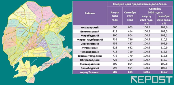 В сентябре 2020 года в Ташкенте наблюдалось однонаправленное движение цен предложения по районам. Наибольший прирост за месяц показала СЦП в Юнусабадском районе (0,7%) Наименьший – в Яшнободском и Бектемирском (соответственно, на 0,3% и 0,2%) районах.