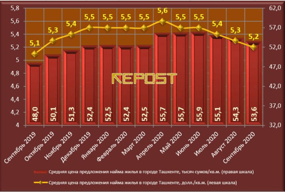 - Средняя стоимость найма квартир в сентябре 2020 года в Ташкенте снизилась на 1,9% (до уровня 5,2 доллара/кв.м.) В национальной валюте стоимость найма квартир также уменьшилась по сравнению с августом на 1,3% и составила 53,6 тысячи сумов/кв.м.
