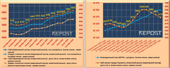Индекс стоимости жилья (средняя цена предложения, скорректированная на усреднённый размер дисконта или скидки при совершении сделок между продавцами и покупателями квартир) в сентябре 2020 года по сравнению с уровнем предыдущего месяца вырос в долларовом выражении на 0,3% до значения 640 долларов/кв.м., а в сумовом, соответственно, на 0,9% и до 6 595,2 тысячи сумов/кв.м.