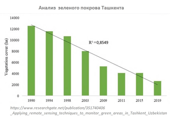 Более наглядно степень сокращения зелёных насаждений в Ташкенте в течение 30 лет видно на следующей схеме: