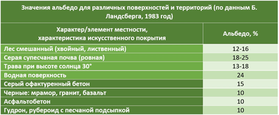 В результате в городах уменьшается альбедо (коэффициент отражения светового потока) подстилающей поверхности. Большая часть элементов городской застройки (например, улицы и дороги, мягкие кровли зданий) имеет более низкое альбедо, чем естественный ландшафт.