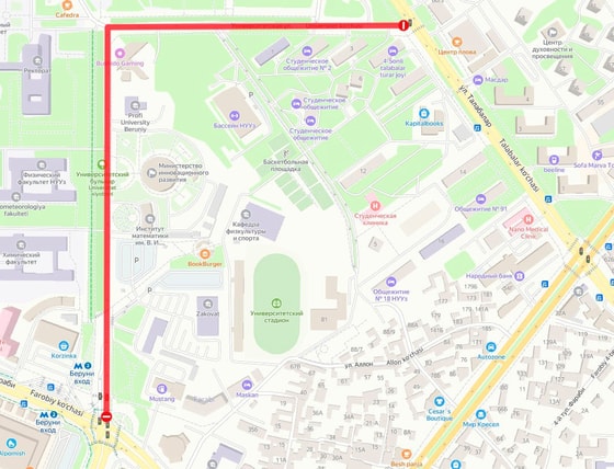 - улица Фараби — от пересечения с Университетской улицей до пересечения с улицей Талабалар.