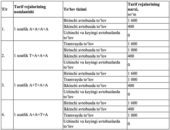 Помимо этого будут введены гибкие тарифы со скидками при пересадках с одного маршрутного транспорта на другой в течение часа: вторая пересадка — 400 сумов, последующие — бесплатно. В случае пересадки на трамвай сумма проезда составит 1 000 сумов.