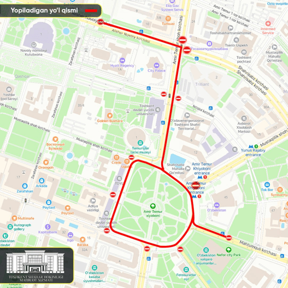 - от пересечения проспекта Амира Темура и улицы Алишера Навои до парковки отеля Hyatt Regency.