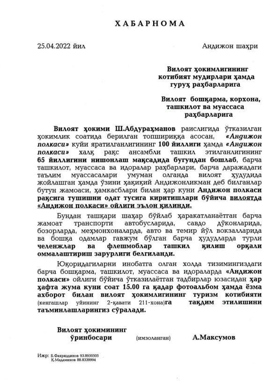 Заместитель хокима Андижанской области по вопросам туризма, спорта и культуры Азизхон Максумов поручил руководителям областных органов госуправления, организациям и предприятиям с 25 апреля организовать каждодневное исполнение андижанской польки и объявил по области «месячник андижанской польки». Фото документа распространилось в социальных сетях.