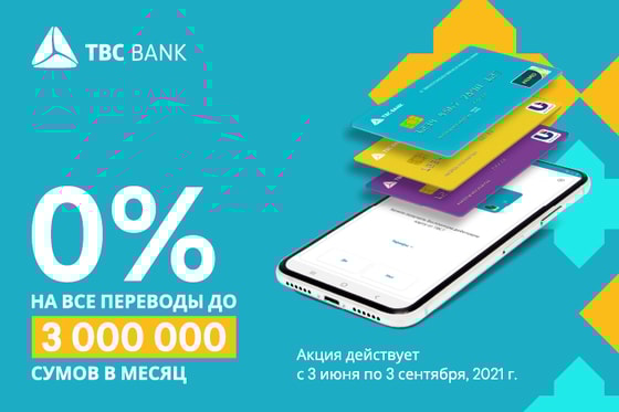 TBC Bank предлагает каждому пользователю ежемесячно совершать переводы на любые направления с комиссией 0% до 3,000,000 сумов. А на сумму свыше 3,000,000 сум ставка комиссии составляет всего 0.4%.