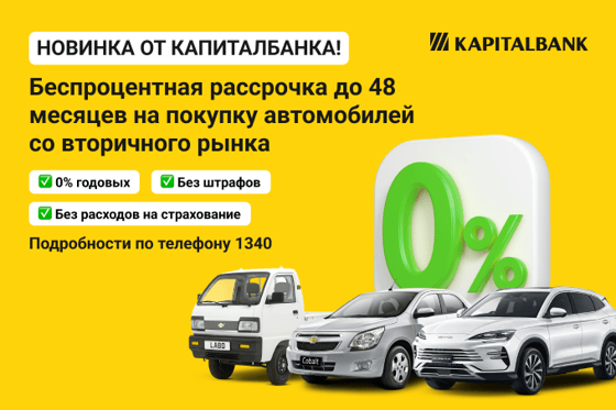 В рамках проводимой работы по внедрению исламского банкинга, а также в целях развития и поддержки малого бизнеса в Узбекистане АКБ «Капиталбанк» предлагает новый финансовый продукт — беспроцентную рассрочку на покупку автомобилей для самозанятых лиц и индивидуальных предпринимателей сроком до 48 месяцев.