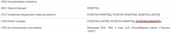 Согласно данным, компания зарегистрировала в Узбекистане свой логотип и товарный знак «РОЗЕТКА ЛИМИТЕД», а также его транслитерацию ROZETKA LIMITED.