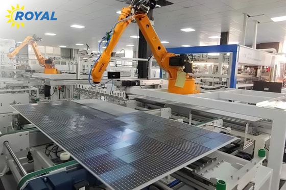 Современное оборудование которое будет использоваться при выпуске панелей ROYAL обеспечит полную автоматизацию производственного процесса. В нём также задействуют самые передовые технологии и используют фотоэлементы высокой эффективности: PERC, TopCON, HTJ, а увеличенное количество межблочных соединений от 9 до 22 Busbar уменьшит нагрузку приходящуюся на солнечную панель. Среди ряда преимуществ панелей ROYAL — специальное стекло с антирефлекторным покрытием (ARC). Оно беспрепятственно пропускает солнечную энергию и защищает поверхность от внешних воздействий. Кроме того, оно обладает высокой скользкостью поверхности, так что пыль не будет оседать на поверхности панелей. Использование специализированных промышленных роботов ESTUN, KUKA обеспечит гарантированно высокое качество конечного энергосберегающего продукта эффективностью более 21,7%.