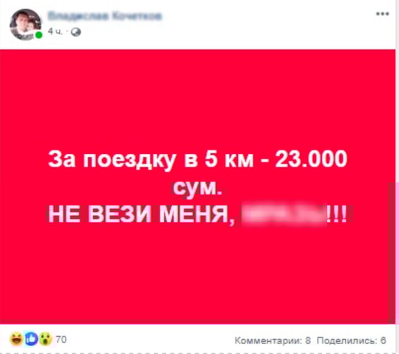 В социальных сетях начали появляться публикации жителей столицы, которые недовольны резким скачок цен на такси. Подобная ситуация произошла из-за введения новых карантинных мер по всей республике. Теперь в Узбекистане ограничено движение транспортных средств, а работа общественного транспорта и вовсе прекращена.