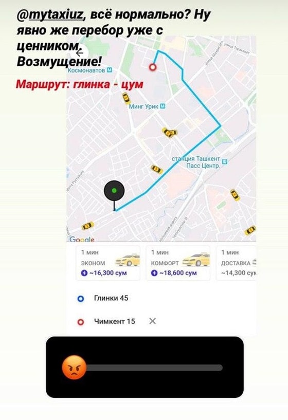Идентичная ситуация произошла и с MyTaxi, ценовая политика эконом класса от центра до САМПИ теперь начинается от 22 000 сумов. При этом приложение постоянно оповещает об отсутствии свободных машин. Оба приложения указывают на высокий спрос вне зависимости от времени суток.