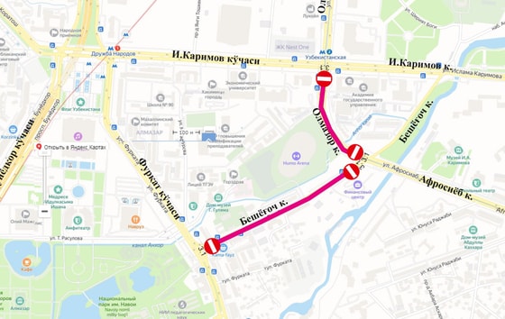 Промежуток от улиц Фуркат и Бешагач до улицы Афросиеб будет перекрыт. Улицы Алмазар и Каримова до улицы Бешикташ также будут закрыты для транспорта.