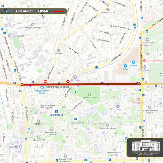 В связи с этим с 22:00 7 июня до 06:00 8 июня будет ограничено движение по улице Темура Малика от пересечения с улицей Университет до пересечения с улицей Мирзо Улугбека.