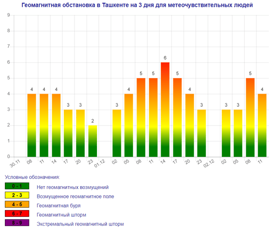 Завтра (1 декабря) в Ташкенте ожидается магнитная буря мощностью шесть баллов, следует из данных сервиса Meteonova.