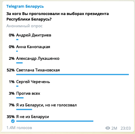 На момент написания данной новости, в опросе приняли участие свыше 1,4 миллиона человек, среди которых 52% указали, что голосовали за Светлану Тихановскую, 2% пришлись на действующего президента Александра Лукашенко, еще 1% на кандидата Сергея Череченя.