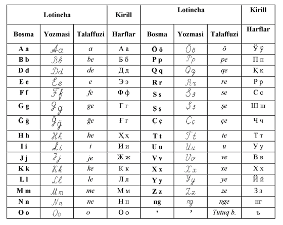 Проект был разработан Академией наук Узбекистана и включает в себя 28 букв, 1 апостраф, а также букосочетание (ng). Главным изменением стало появление букв «ş» и «ç», которые, согласно проекту, заменят ныне используемые «ш» и «ч». Кроме того, появятяс буквы «ŏ» и «ğ», которые станут заменой букв с апострофами «oʻ» и «gʻ».