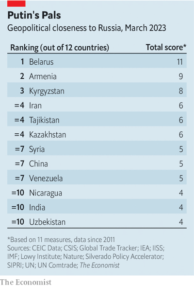Журнал The Economist опубликовал рейтинг стран, геополитически близких к Путинской России.