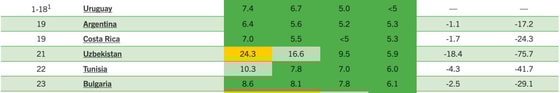 На строку ниже Узбекистана стоит Тунис, выше — Коста-Рика.