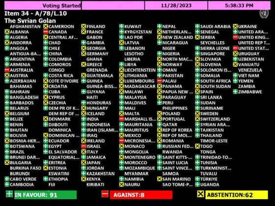Генеральная Ассамблея ООН приняла резолюцию с призывом к Израилю освободить Голанские высоты, сообщает РБК.