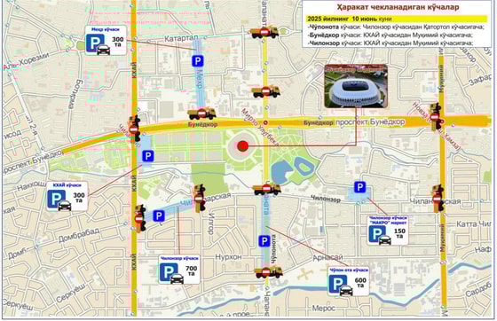 Bunga o‘sha kuni O‘zbekiston va Qatar o‘rtasida o‘tkaziladigan o‘yin sabab bo‘ladi. Yopiladigan ko‘chalar:
